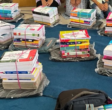Voor hun schoolwerk krijgen de grotere leerlingen schriften in A4-formaat en pennen in plaats van potloden. Voor de jongere kinderen zijn er all-in-one boekjes. En natuurlijk zijn er tekenschriften – altijd een hit!
